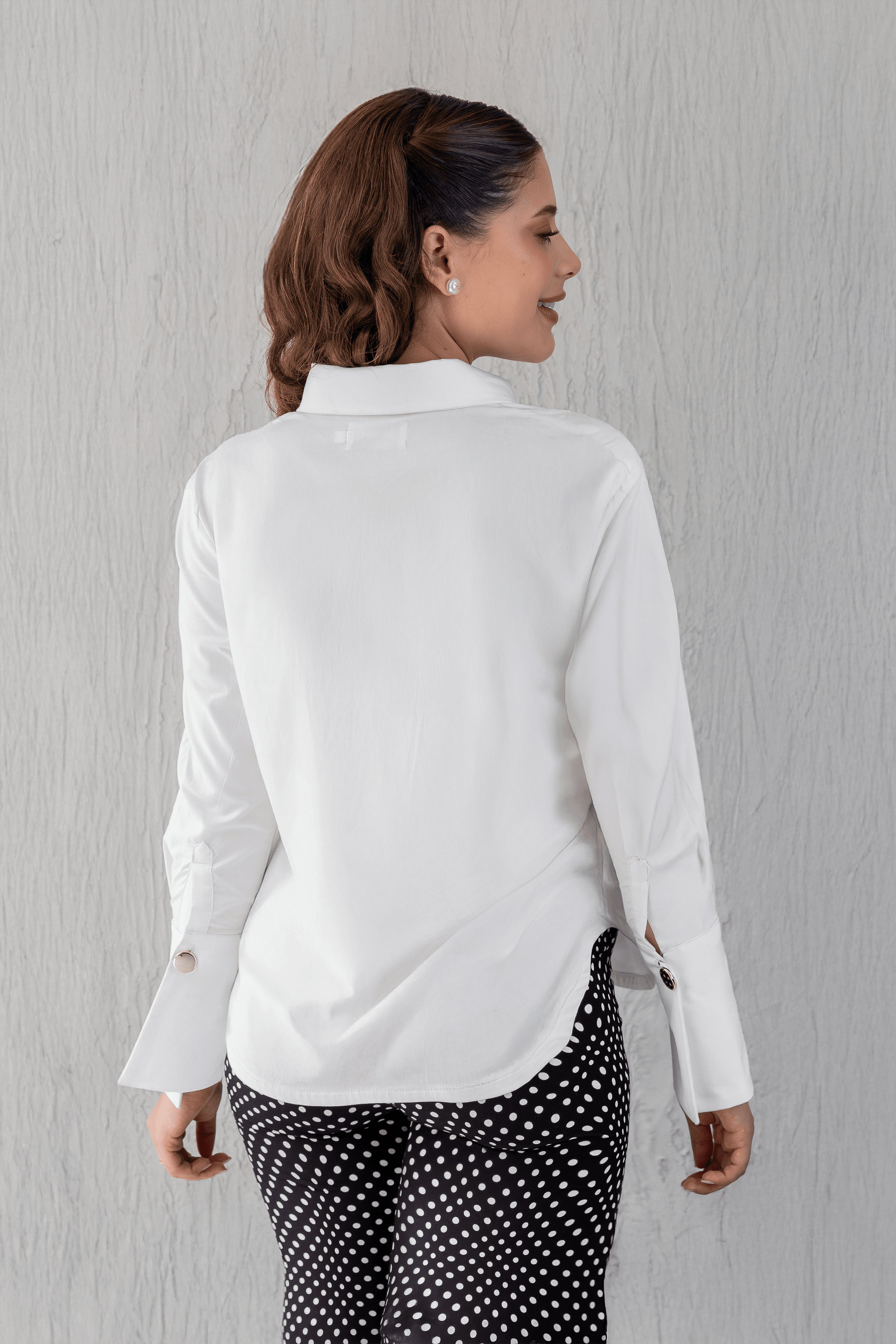 Los detalles dorados —un botón en el cuello y otro en cada puño— aportan ese brillo discreto que eleva el look sin esfuerzo. El resto de la botonadura permanece oculta, permitiendo que la blusa respire pureza, intención y una elegancia que no necesita anunciarse.