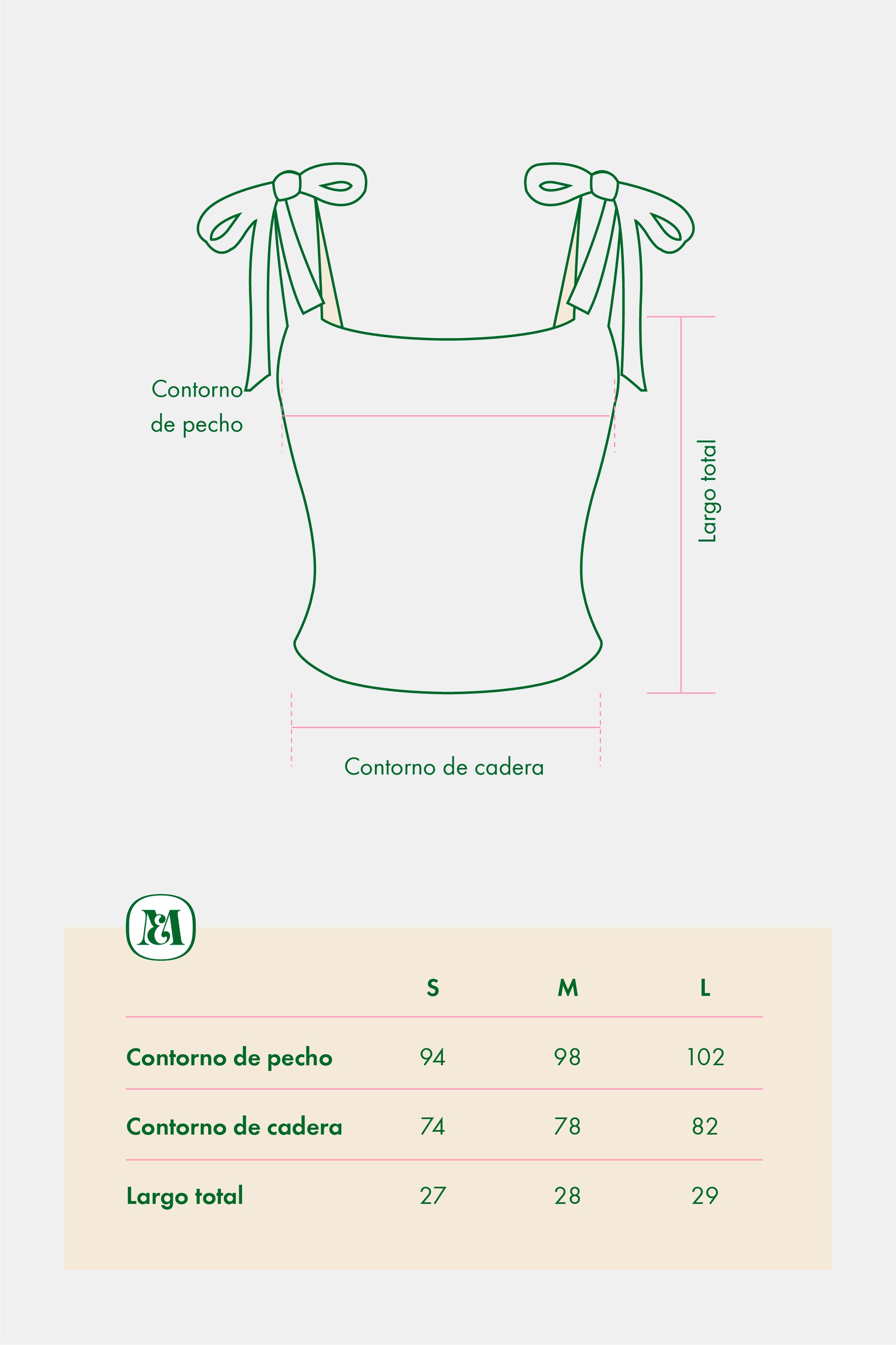 El top crop Tilly celebra la feminidad con una construcción impecable y un encanto clásico que vuelve a brillar esta temporada. Sus tiras anchas que se anudan sobre los hombros forman un lazo romántico, un detalle que aporta movimiento y enmarca el torso con elegancia consciente.