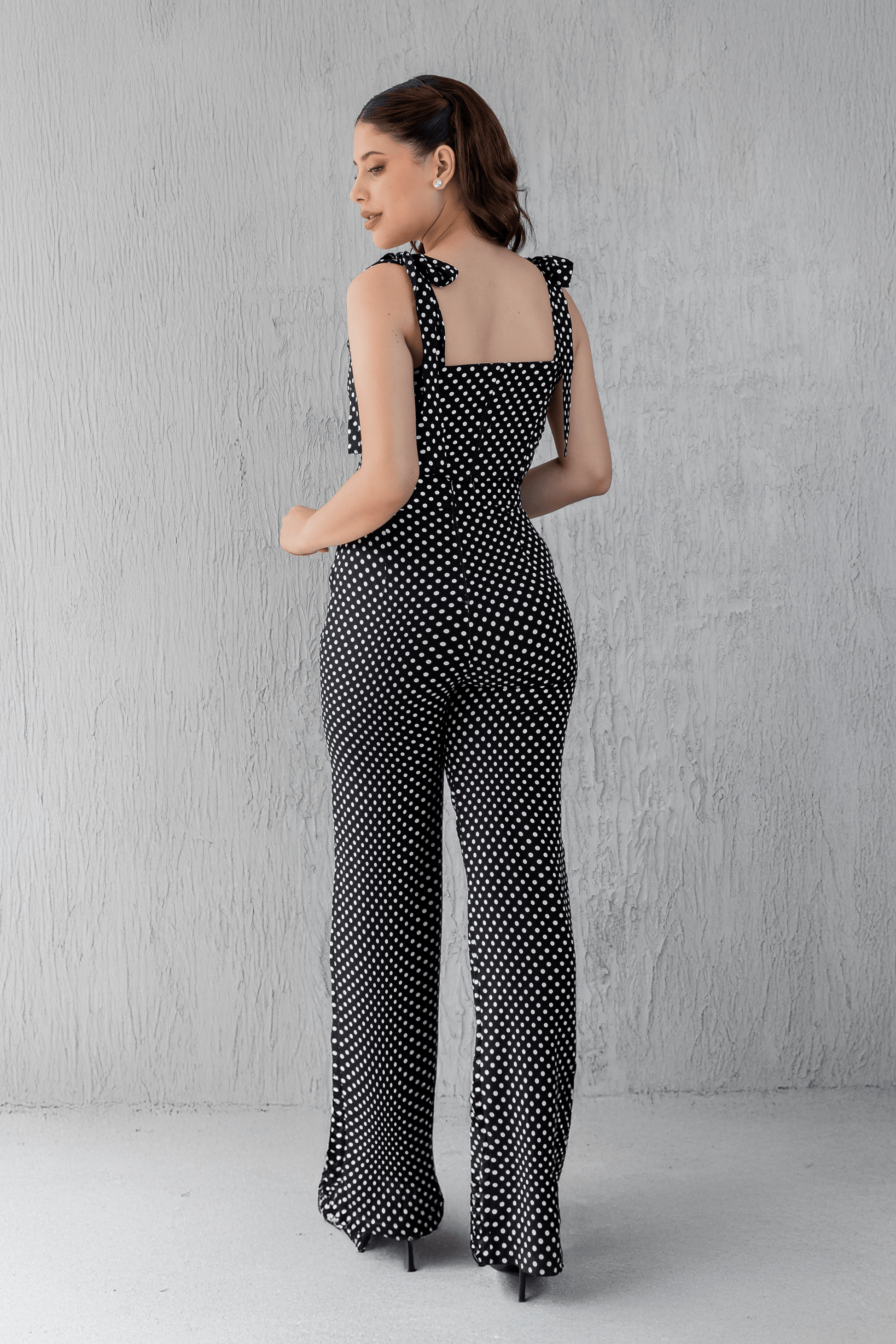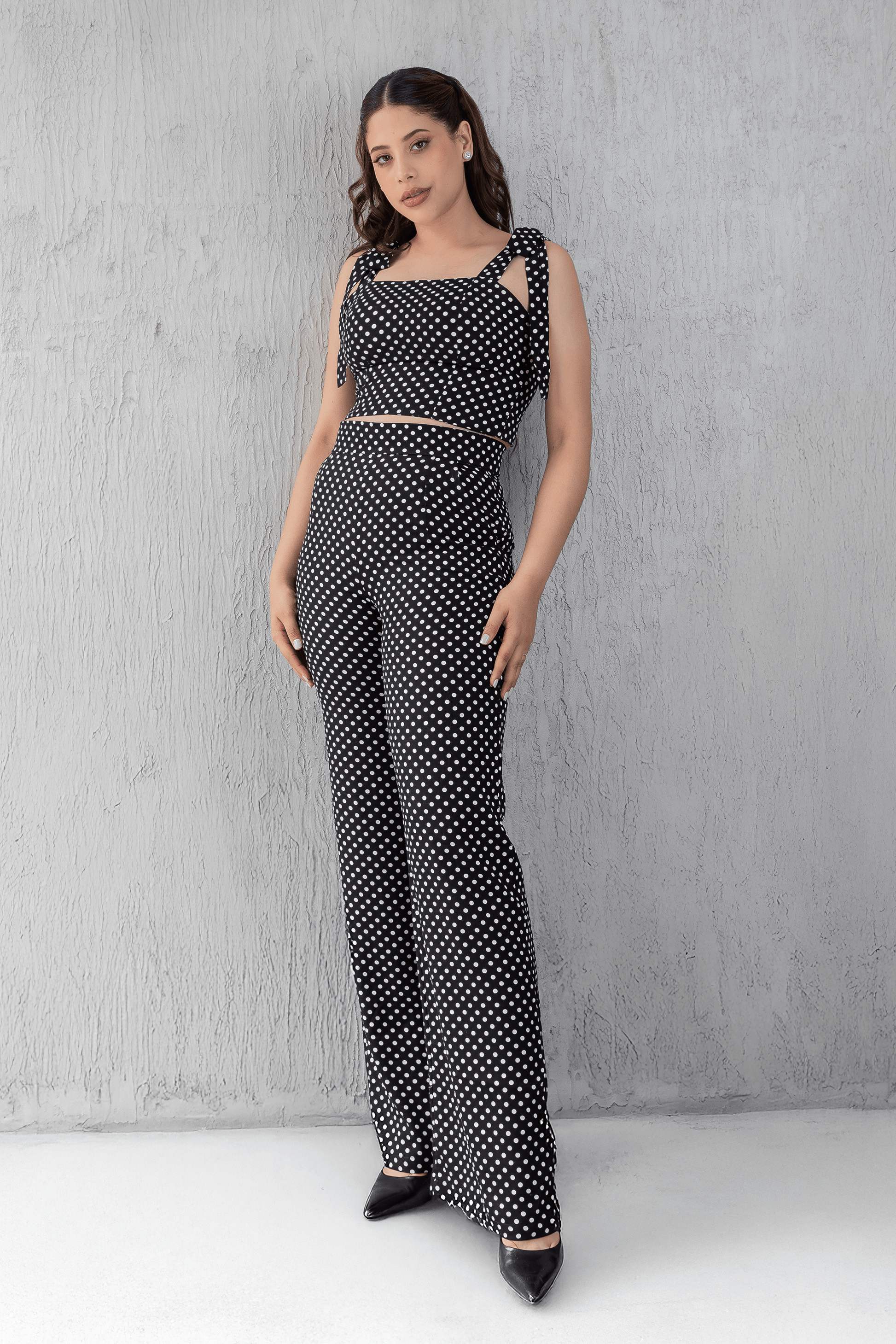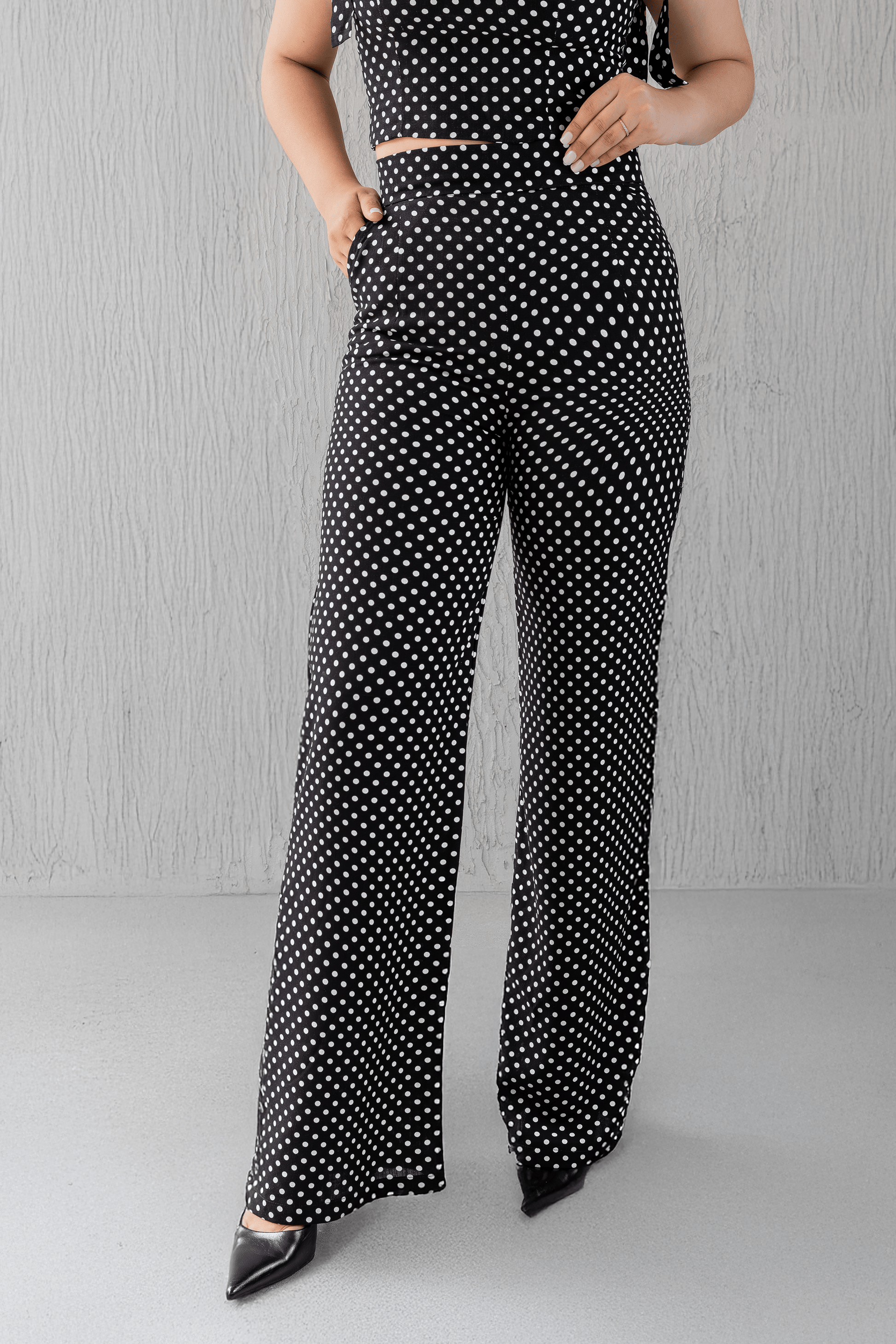 El estampado polka dots, protagonista del set, se repite en el palazo creando un diálogo armónico entre ambas piezas. Su patrón clásico —que esta temporada regresa con una fuerza renovada, conquistando colecciones desde lo romántico hasta lo minimalista— aporta dinamismo y un movimiento visual que potencia la estética del conjunto.